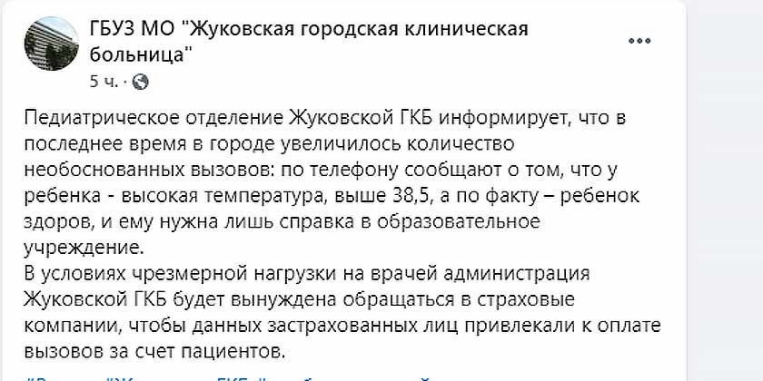 «Педиатрическое отделение Жуковской ГКБ информирует, что в последнее время в городе увеличилось количество необоснованных вызовов: по телефону сообщают о том, что у ребенка — высокая температура, выше 38,5, а по факту – ребенок здоров, и ему нужна лишь справка в образовательное учреждение», — сообщает ГБУЗ МО «Жуковская городская клиническая больница» на своей странице в социальной сети Facebook.