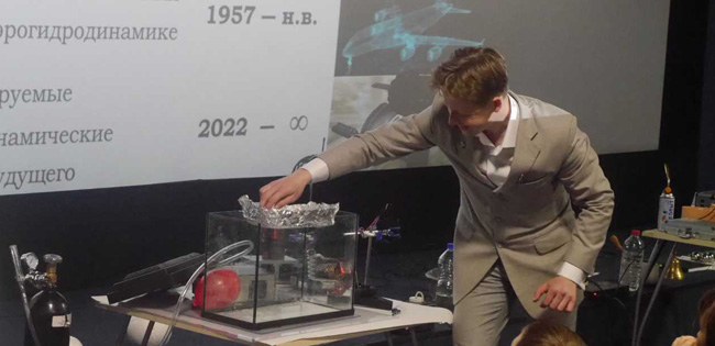 Старший научный сотрудник, к.ф.-м.н., председатель научно-технической комиссии профсоюза ФАУ «ЦАГИ» Иван Амелюшкин выступил на фестивале с интерактивной лекцией «Физика полета. История и перспективы аэромеханики и летательной техники». Он рассказал об истории развития аэромеханики и летательной техники, рассмотрел различные аэрогидродинамические процессы и перспективные аэрокосмические технологии. Были наглядно продемонстрированы эффектные физические опыты, такие как аэроакустические явления в газах, полет тел в воздушных струях, формирование торнадо в воздухе, молнии, визуализация турбулентного потока, вихревые кольца и другие эксперименты.