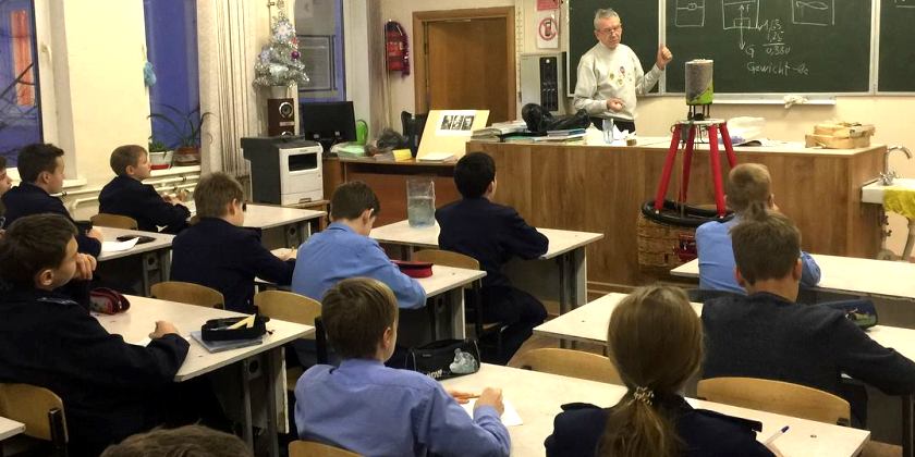 Руководитель городского клуба воздухоплавания, кандидат технических наук, Валерий Дмитриевич Бокша, в наглядной и увлекательной форме рассказал и продемонстрировал принципы подъёма тела в воде и воздухе, напомнил ученикам легенду об Архимеде.