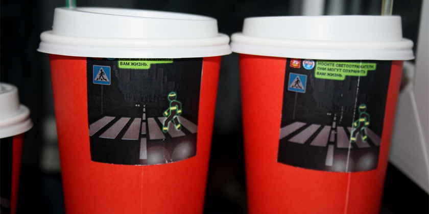 Стикеры на кофейных стаканчиках напомнили о важности ношениях световозвращателей и о дорожной безопасности в период зимних каникул