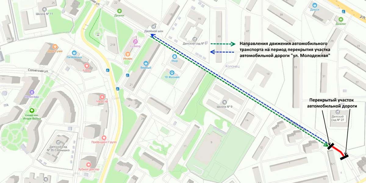 В связи с проведением ремонтных работ тепловых сетей, с 09:00 4 сентября до 09:00 7 сентября ограничивается движение автомобильного транспорта на улице Молодежная. Перекрывается небольшой участок дороги от поворота с улицы Дугина до дома с адресом Дугина, 8/1.