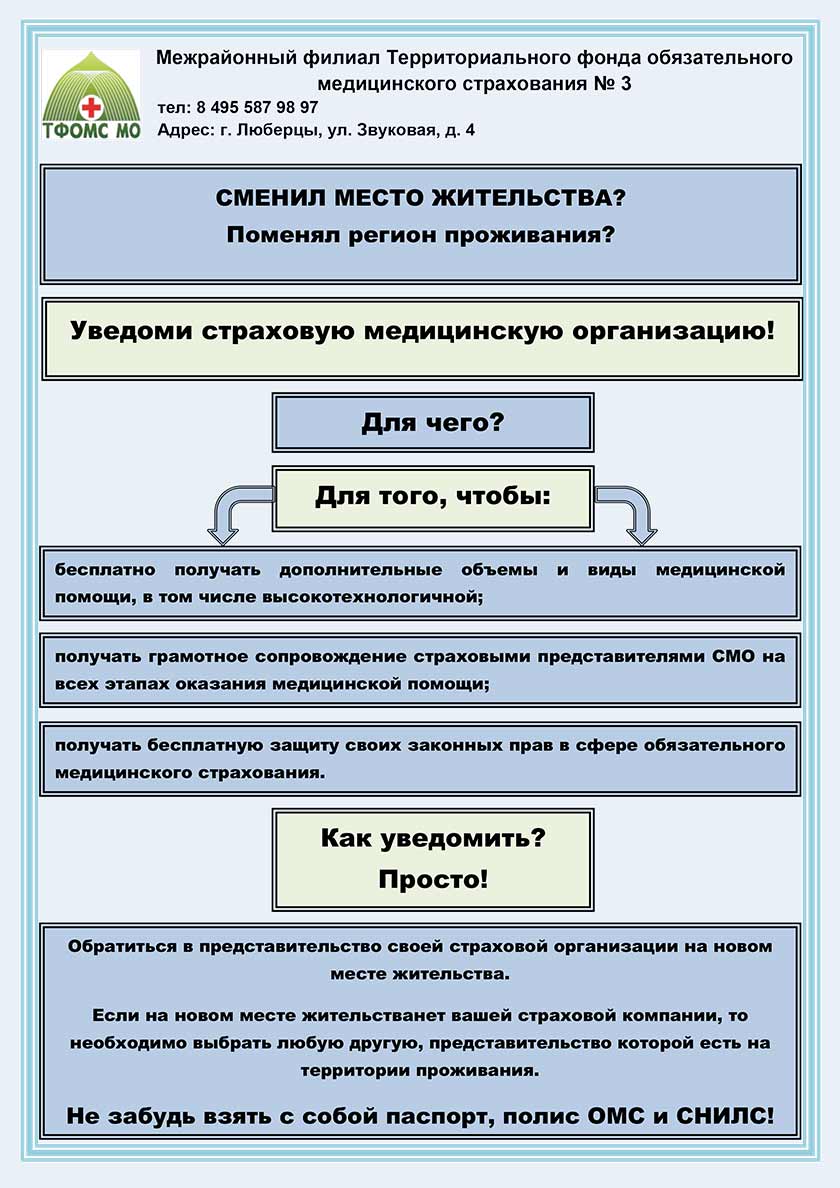 Меняя место жительства и регистрацию, стоит в кратчайшие сроки обратиться в страховую компанию, чтобы переоформить полис обязательного медицинского страхования (ОМС) или сообщить данные об изменениях адреса. Это поможет в дальнейшем избежать неприятных ситуаций с получением медицинской помощи в случае необходимости, сообщает Межрайонный филиал № 3 Территориального фонда обязательного медицинского страхования Московской области (ТФОМС МО).